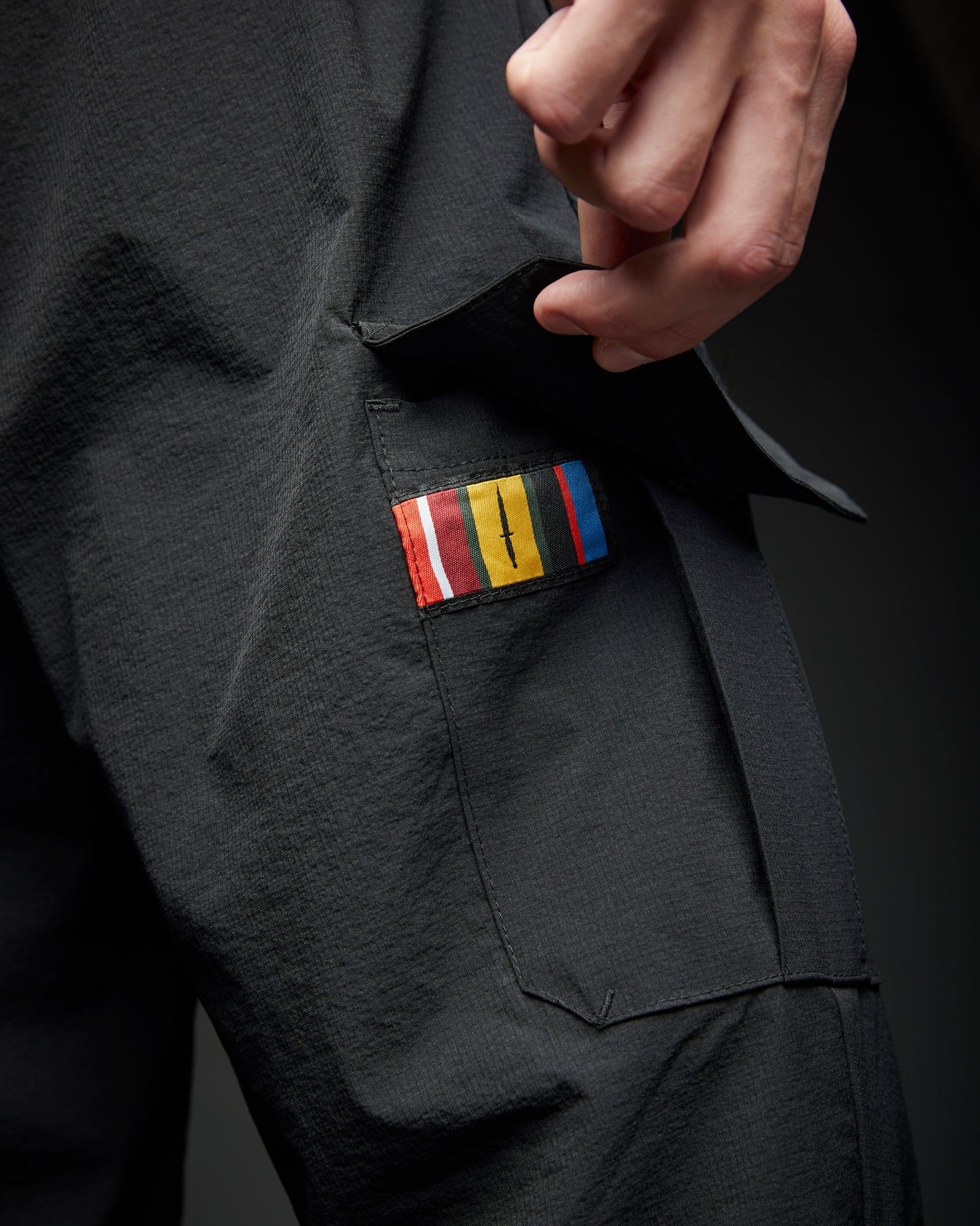 Vores enhedsmærke er halv gemt under den ene sidelomme. Den er sammensat af farverne fra det danske flag og specialstyrkernes enhedsmærker, mens daggerten i midten er det globale symbol for specialoperationsstyrker (SOF).