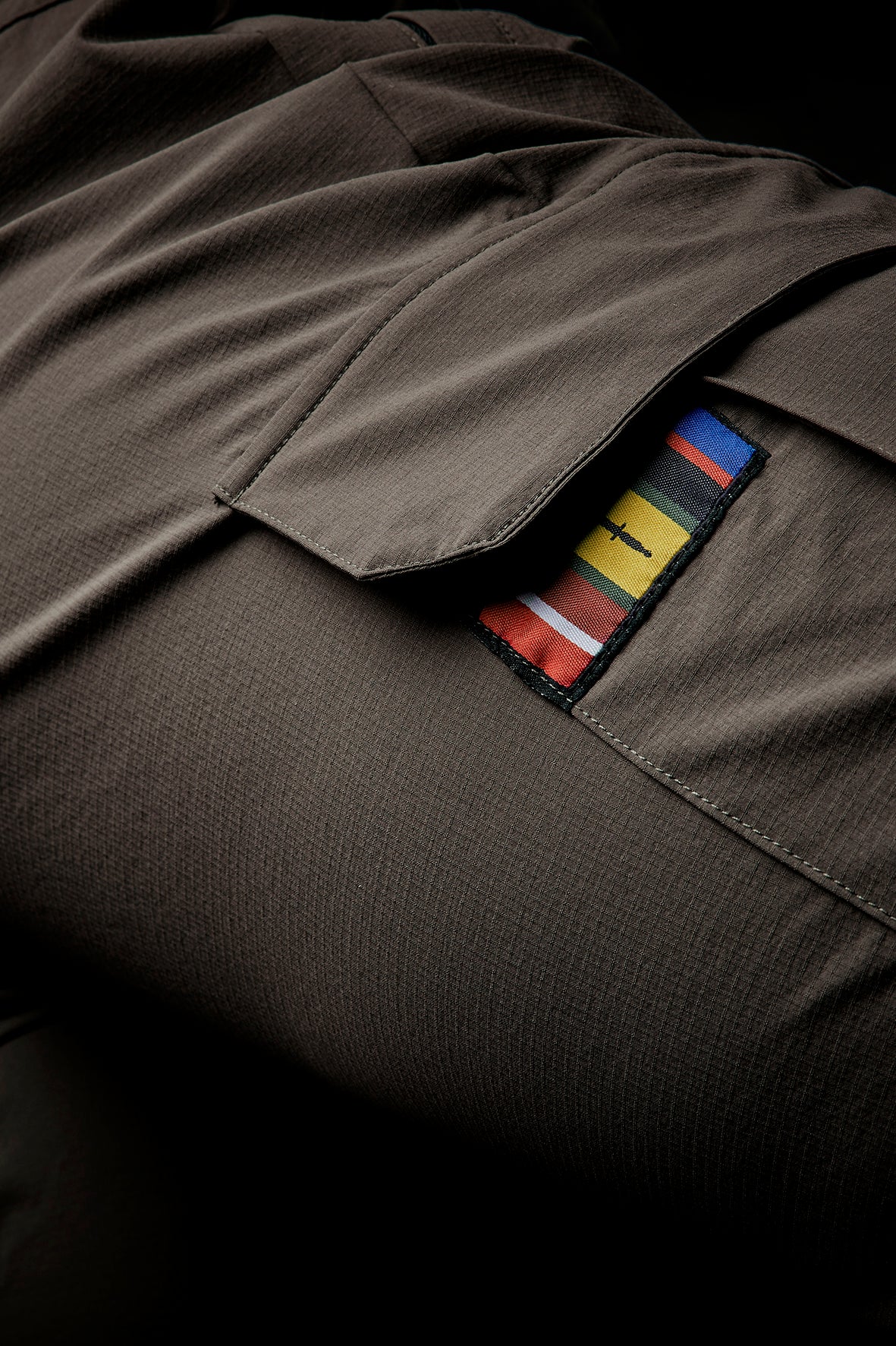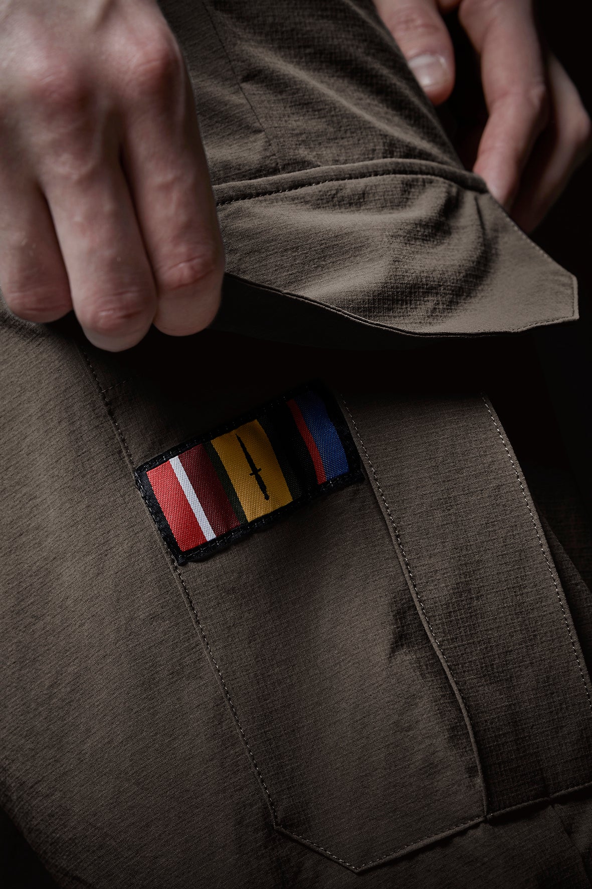 Under den ene sidelomme finder du et diskret placeret enhedsmærke, inspireret af specialstyrkernes farver og det danske flag. En hyldest til vores DNA: funktion, robusthed og militær præcision, transformeret til hverdagsbrug.